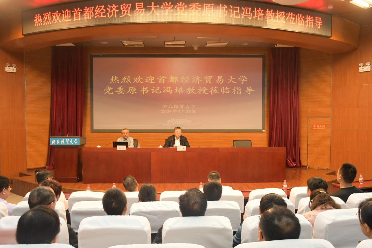4月25日下午,我校邀请首都经济贸易大学党委原书记冯培教授作题为《基于教育数字化3.0时代的高校思想政治教育工作设计》的报告。报告会由河北经贸大学党委书记刘兵主持,校领导班子、学校相关部门负责人及各mgm美高梅