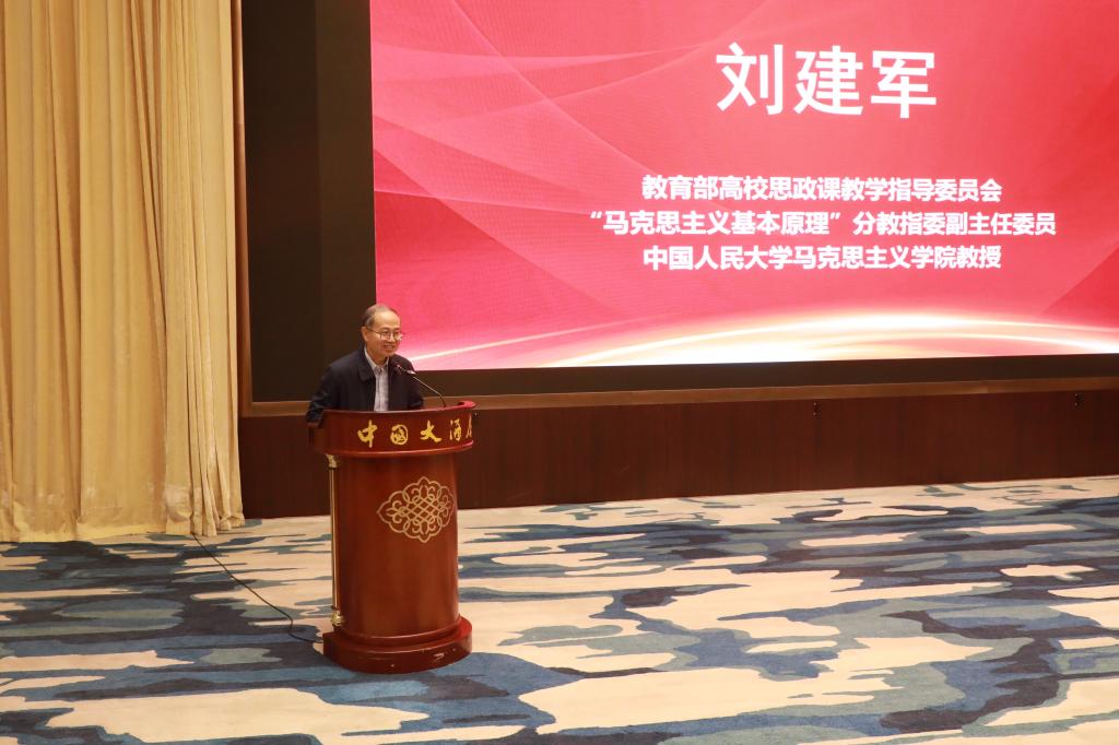 刘建军教授以《马原理中的概念相似性问题》为题,指出马克思主义基本原理体系中概念丰富,一些同等层次的概念很相似,甚至字面上相同,但实际不完全一样。如果教师在使用时比较随意,表达不太精确、概念不太统一,不进行区分,就会造成学生学习的困难。刘建军列举出“基本原理”与“基本原则”、“世界观”与“宇宙观”、“同一”与“统一”、“工人阶级”与“无产阶级”、“生产”与“劳动”、“社会发展”与“社会进步”、“相适应”与“相适合”等十组概念进行了说明。
