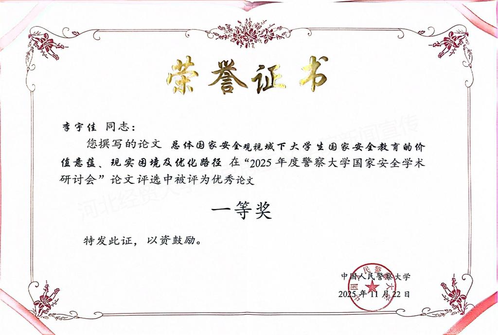 2024级研究生李宇佳的论文《总体国家安全观视域下大学生国家安全教育的价值意蕴、现实困境及优化路径》脱颖而出,荣获优秀论文一等奖,其本人受邀参会并在国家安全与教育论坛中发表主题发言。